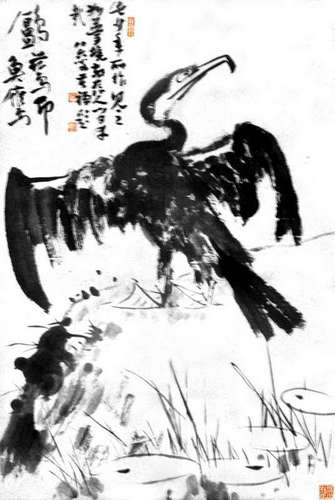 苦禅大师的画,源于自然,融乎心田,流诸笔端,复归于自然的“天籁自鸣”之境界。他主张“书至画为高度,画至书为极则”,因此,他的画笔力雄健,气势浑厚,以大手笔、大写意、大写情而著称,在中国写意花鸟画方面有突出的贡献。