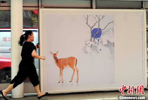 5月7日,市民走过电车站。香港电车等推出艺术项目《站·艺廊》,透过闹市中电车站这个平台,让本地艺术家将其作品与香港市民分享。中新社发 谭达明 摄