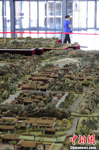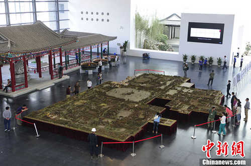 5月14日,中国园林博物馆对媒体首次开放,以1:150的比例制作的圆明园极盛时期复原木雕现身博物馆正中央,吸引不少参观者驻足。中新社发 崔楠 摄