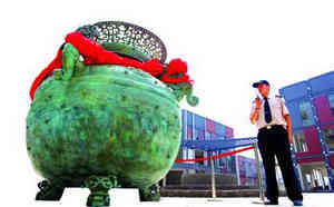 昨日10时,罍雕塑身披鲜艳红绸安放在广场上。据介绍,罍雕塑在罍街开业前期将放置在有喷泉和灯光效果的底座上。这件罍雕塑,是在安徽蚌埠出土的“春秋镂空龙耳罍”的原物基础上放大100倍,用上等青铜耗时2个月制作而成。