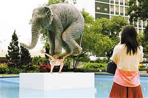 雕塑由树脂与玻璃纤维制成,显示出一个弯腰驮着大象的男人,正相当努力地平衡背上的重担。