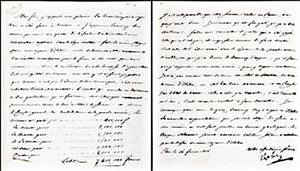 这封拿破仑1806年写给尤金王子的亲笔信在经过70余轮的激烈竞价后,最终以304.75万元成交,超过估价50余倍。1805年5月,拿破仑加冕为意大利国王。此封信中拿破仑交代尤金王子把部分税收用于支付意大利驻军费用,第一页详细列出了每个区域需要支付的数额,并表达了希望扩军和组织舰队的想法。第二页左下角有拿破仑的亲笔全名签名,信札保存完好。(汪文)