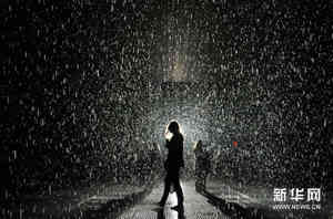 “雨屋”是随机国际(Random International)艺术组织在美国纽约推出的一项大型现代装置艺术展,该展览以其独特的数字三维为基础,利用数字技术控制雨水的下落,当观众的身体经过一个落雨的环境时,可以停止雨落。新华网图片 王雷 摄