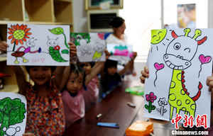 5月29日,安徽省合肥锦雯言语康复中心的“听障”儿童们“六一”儿童节前,在青阳路志愿者的帮助下用画笔画出梦想和希望。并用手语表达对父母、老师的感恩之情。中新社发 韩苏原 摄