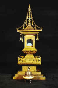 舍利子为高僧长年聚丹修行打坐,修行成果的见证,戒、定、慧成就之结晶,慈悲喜舍无量功德所成之凝结晶莹如珠、如花之物。这件供塔铜质,鎏金,做工精致。 笑颂