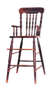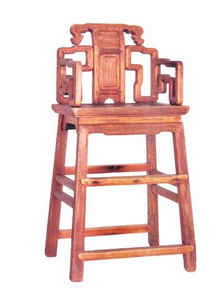 为了让孩子坐得和大人一样高,可以在一个桌子上同时吃饭,专门为孩子打制童椅。童椅座面比普通椅子高许多,并在中间增加踏脚档,如拔高了的太师椅。