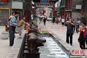 6月19日,太原食品街的“十二兽首”局部已经掉色。近日,一组仿制版“圆明园十二兽首铜像”在山西太原食品街亮相,诸多市民带着孩子观赏这组兽首铜像。在现场,这组兽首铜像被安放在一个长约八米,宽约两米的水池中。每个兽首嘴里不停地喷着水柱,一些市民以为是为嬉水而修建。因为市民的热情抚摸,亮相不足20天,部分兽首已经开始掉色。