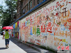 7月4日,中国人民大学的一面涂鸦墙上,涂写了满满的毕业生留言,如“我会想念你,直到再相遇”、“感谢疯狂的青春有你们陪伴”等等。中新社发 李慧思 摄