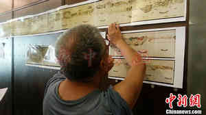 7月10日,古都文化研究专家研究《西湖繁盛全景图卷》彩色复印件。《西湖繁盛全景图》是一幅描绘南宋西湖全景的超长写实画卷,总尺幅为32.9×1581.1厘米,长达16米,是《清明上河图》的近三倍。目前,这幅图收藏在美国华盛顿的福瑞尔美术馆。中新社发 李晨韵 摄