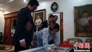 君寿和彭云鹏、白德明等来宾向梅加瓦蒂介绍了“中华腾飞图”的含义,梅加瓦蒂微笑着回答道:“我理解这幅画所表达的美好希望,我们为中国腾飞叫好!更要为印尼腾飞加油!”