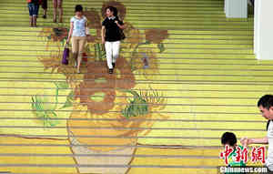 亮点之一是海运大厦正门长楼梯展出由梵高为人熟悉之作品《向日葵》制作而成5米高的巨型楼梯画作,震撼游人视觉的艺术享受。中新社发 洪少葵 摄