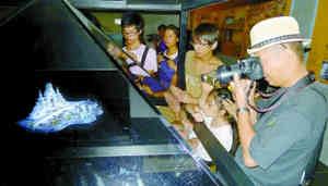 8月20日,观众在北京观赏三维动画再现的圆明园建筑盛景。