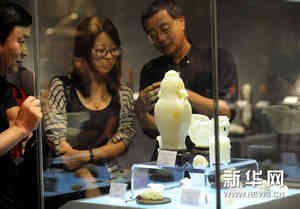 9月4日,在北京天坛古玩城,参观者在“苏帮”玉雕艺术精品展上欣赏玉雕作品。新华网图片