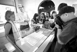 图为工作人员向媒体记者介绍咏叹调《飞吧,让理想乘上金色的翅膀》手稿。