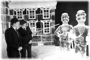 1月11日,在比利时布鲁塞尔的冰雕节上,两名男子站在《丁丁历险记》中“笨侦探”形象的冰雕旁。