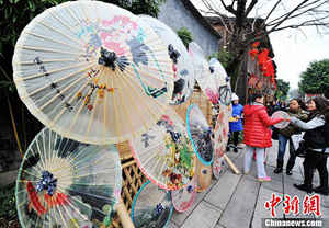 2月10日,游人在福州中国历史文化名街三坊七巷内选购“油纸伞”。油纸伞是“福州三宝”之一,也是外地游客首选的纪念品。中新社发 张斌 摄