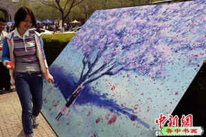 4月7日,天津大学北洋广场一角,一位女大学生正要往画作上摁手印,为“海棠花”画作添彩。 当日,天津大学举行校园开放日,为学生和家长提供高考招生咨询,邀请市民入校欣赏海棠绽放的盛景,并通过开放实验室、中国传统文化游园会等互动节目将天大的科研教学实力和丰富的校园生活展示给咨询学生及游览的市民。中新社发 张道正 摄