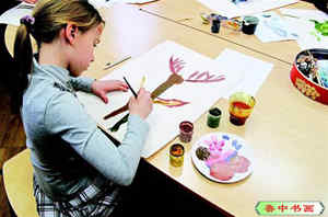 图为:俄罗斯女孩在描绘鹿角立鹤。
