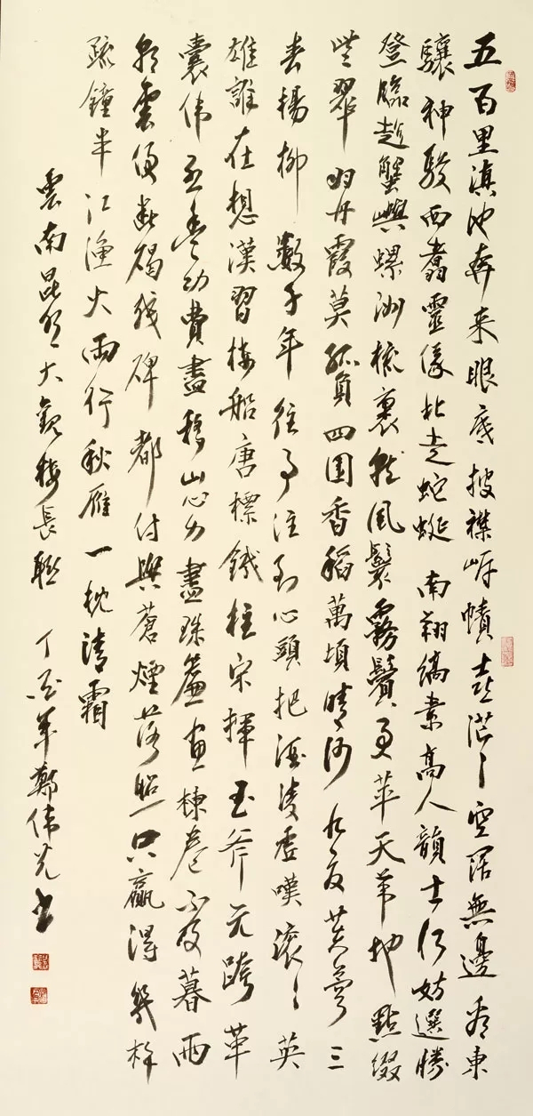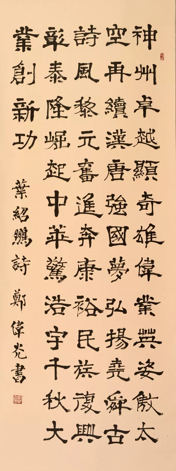 叶绍鹏诗 155cmx62cm 郑伟光艺术简介: 郑伟光:跟容绳祖老师学习中国书画,也曾向陈春盛、黄汕、何展平老师求教。中国硬笔书法高级培训师,中国硬笔书法协会会员;中国文化信息协会(工艺美术专业委员会)会员;中国文化管理协会艺术品市场管理委员会会员;广东省硬笔书法协会会员;广东省老干部书画诗词摄影家协会会员。现任三乡理工学校图书馆馆长。 从教37年,任教书法17年;10多篇教学论文获省级、国家级论文评比一、二等奖,并在国家级、省级刊物上发表,其中书法教学论文《培养学习兴趣 激发创作潜能》获广东省教育学会2009年度学术讨论会二等奖,并在《文苑》杂志上发表;多篇诗文在报刊上发表;硬笔书法作品和毛笔书法作品连续多年获广东省职业技术教育学会举办的职业院校师生书法作品展评二等奖。曾在三乡子健体育馆举办师生书法作品展;在广东省举办的“纪念毛泽东同志诞辰120周年”系列大型公益活动中,书法作品被评为优秀作品。在三乡文化中心举办了“乡情金秋书画展”,多次参加在容绳祖美术馆举办的书画展。2014年,书法作品在中央数字电视书画频道“第四届迎新春书画作品展播”特别节目中播出。任教的学生参加镇、市、省乃至全国书法竞赛,硬笔书法作品和毛笔书法作品多次获一、二、三等奖。2013年荣获中山市教育局、中山市语言文字工作委员会颁发的书法教学“优秀指导老师”称号;同年被中国硬笔书法协会评审委员会评为全国少年儿童书法硬笔书法优秀指导老师;2015年12月,指导学生参加" 第五届广东省职业院校汉字书写技能大赛”成绩显著,被广东省职业技术教育学会评为书法教学“优秀指导教师”;2015 年10月书法作品入编中华人民共和国文化部文化艺术人才中心主编的《70年7大家》及《永恒的丰碑》典籍中;2016年,参加北京中艺博雅科技文化有限举办的“大美艺术书画作品展”(杭州站、青州站、西安站及厦门站);2016年3月,书法作品编入中国邮政、中国国际集邮网主编的《国家名片 邮票上的十大书画艺术大家》一书的首页;2016年书法作品编入中国中外名人文化研究会学术委员会主编、中国文联出版社出版的《人民喜爱的书画家》文献中;2016年书法作品入编中国档案出版社出版的《中国书画名录》文献中;2016年3月、9月,2017年2月,《文化月刊》刊登了我写的文章《师恩毋忘,师道如山一一我的老师容绳祖》及我的书法作品;2016年12月,参加文化部直属单位中国对外文化集团公司主办的“中华文化澳门行”作品展活动;2017年,书法作品编入《收藏与投资 翰墨迎两会》文献中,并向两会及全国大量发行;2017年4月,10幅作品在中山市工人文化宫展出;2017年,作品编入谷满屯先生主编的《传承与超越中国当代艺坛典范人物》文献中;2017年9月17日,10多幅书法作品在中国国家画院(国展)美术中心展出;2017年,书法作品入编吕俊杰主编的庆祝中国人民解放军建军九十周年,香港回归二十周年美术作品集《盛世中国中华情》;2017年11月,参加庆祝香港回归二十周年“一带一路水墨香江”书画交流活动,6幅书法作品在香港沙田大会堂展览厅展出。 |